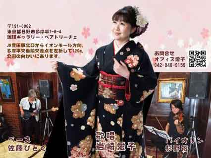 〜春のときめき〜 時間 13:00〜14:30 開場12:30 料金 4,000円(珈琲or紅茶とケーキ、またはワインor生ビールとおつまみ付き) 出演 歌唱:岩崎愛子/ベース:佐藤びとく/バイオリン:杉野裕